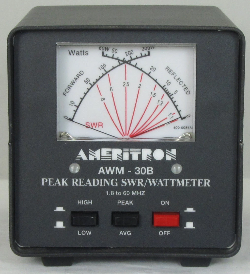 Designed-in-accuracy is the result of a carefully designed directional coupler, an accurate active peak reading circuit and a precision d’Arsonval meter movement. Ameritron’s AWM-30B reads true-peak or average power on a large LED lighted three inch Cross-Needle meter. Handles 1500 Watts, 1.8 to 60 MHz. Has 3000/300 Watt ranges. Reads forward and reflected power and SWR on highly visible dual cross-needle meter movement.