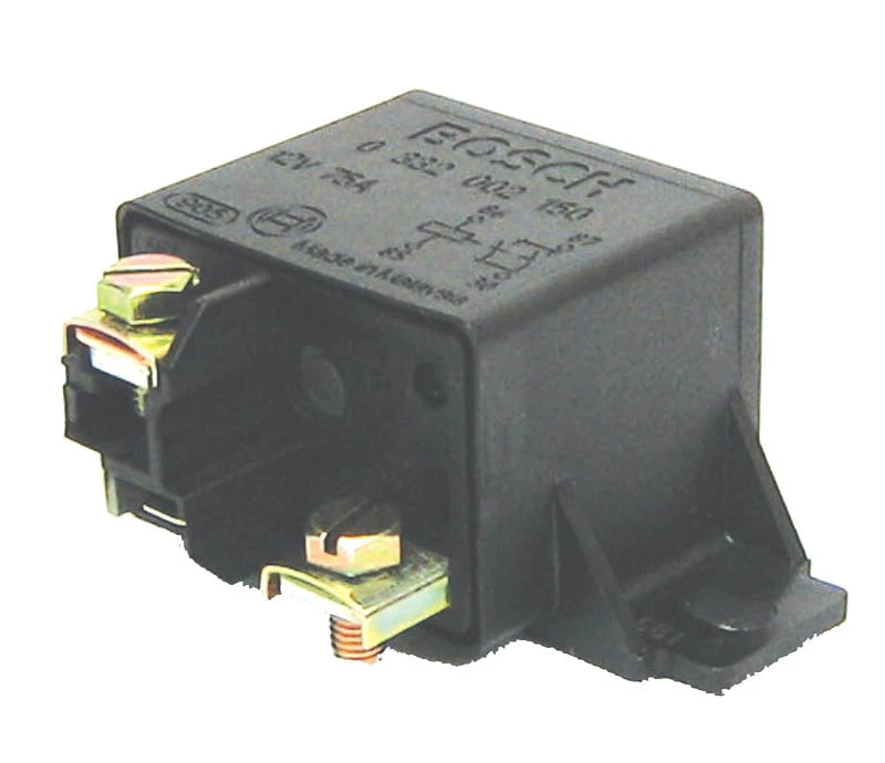 12 VDC Bosch relay. Turns amplifier high current DC supply line ON/OFF remotely with vehicle ignition switch.