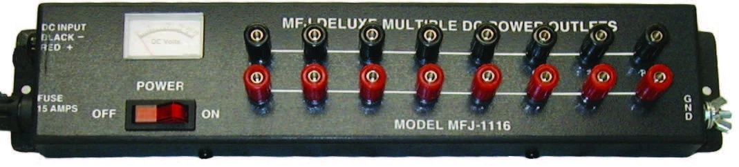 The MFJ-1116 Multiple DC Power Outlet also has a built-in 0-25 VDC voltmeter. Six feet super heavy duty eight gauge color-coded cable with ring tongue terminals. Binding posts are spaced for standard dual banana plugs. Heavy Duty aluminum construction.