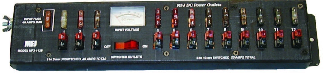 Built-in 0-25 VDC Voltmeter. ON/OFF switch controls outlet 4 through 12, handles 20 Amps total. Outlet 1, 2 and 3 are unswitched, handle 40 amps total. Includes 12 pair of AndersonPowerPole® 24 35A contacts, 10 fuses (2 each: 1,5,10,25,40A).
