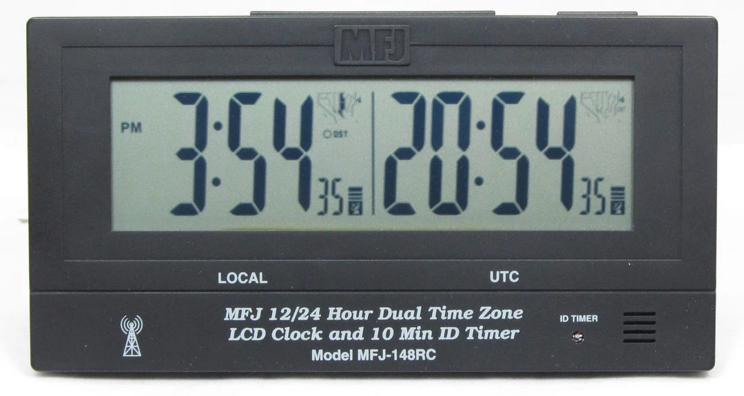 MFJ-148RC is a specially designed clock for amateur radio. It has two independent atomic 24/12 hour clocks with exclusive UTC time zone and a dedicated Station ten minute ID timer.