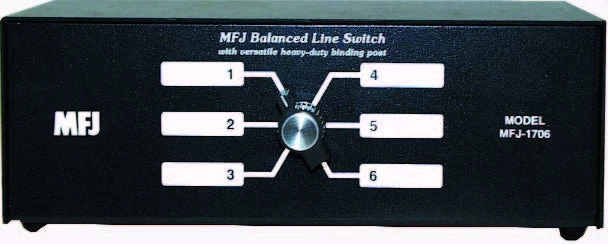 The MFJ-1706 selects one of six different balanced feedlines from 1.8 to 30 MHz. It has heavy duty versatile 5-way binding posts. It will handle the full legal limit.