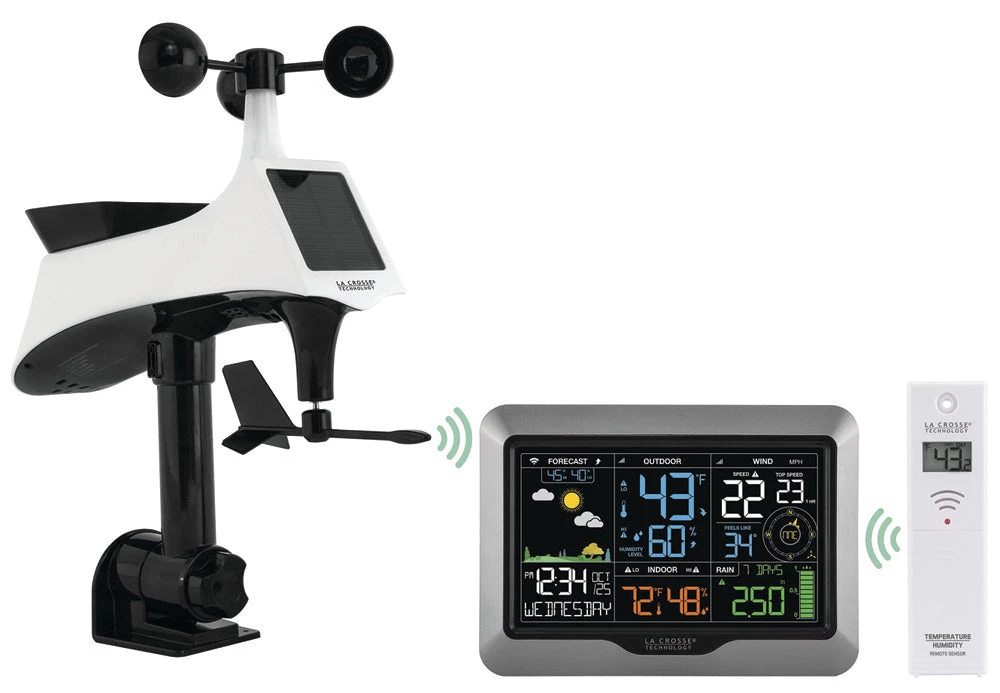Is a LaCrosse Wireless Weather Station that monitors home and backyard weather and shows data on a 8 x 5 3/4 full color LCD Desk Display.