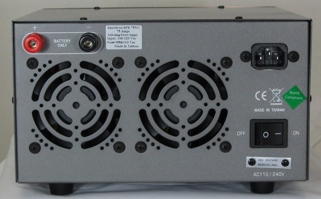 MFJ-4275MV delivers 75 amps maximum and 70 amps continuously without even flexing its muscles. Plugs into any 110 VAC wall outlet.