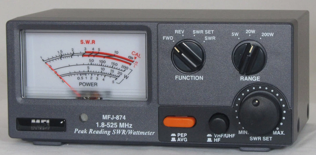 MFJ-874 HF SWR/Power Meter. Covers HF/UHF/VHF (1.8 – 525 MHz). 5, 20, 200 Watt power ranges.
