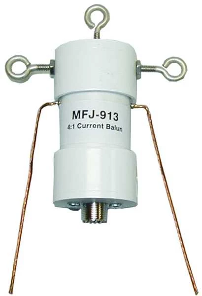 The MFJ-913 is a 300 Watt true current baluns/antenna center insulators that transforms 200 ohms to 50 ohms. Transmission Line Transformer construction using 100 ohm characteristic impedance transmission line gives flat 160-10 Meter response. Large low permeability ferrite cores easily handle full power. SO-239, stainless steel hardware with direct 14 gauge stranded copper wire connection to antenna. Heavy duty weather housing. Measures 4¼ x 2 inch diameter.