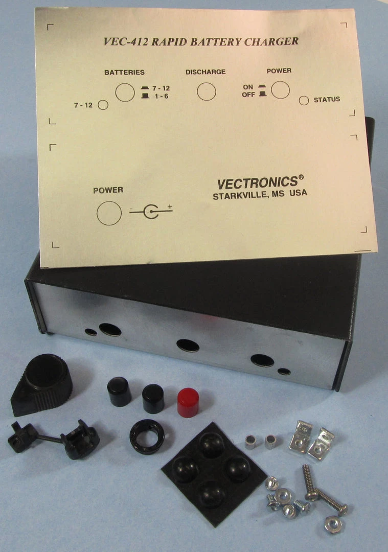Cabinet for the Battery Conditioner Kit VEC-412K. Includes knobs, hardware and rubber feet. has brushed aluminum looking front panel decals.