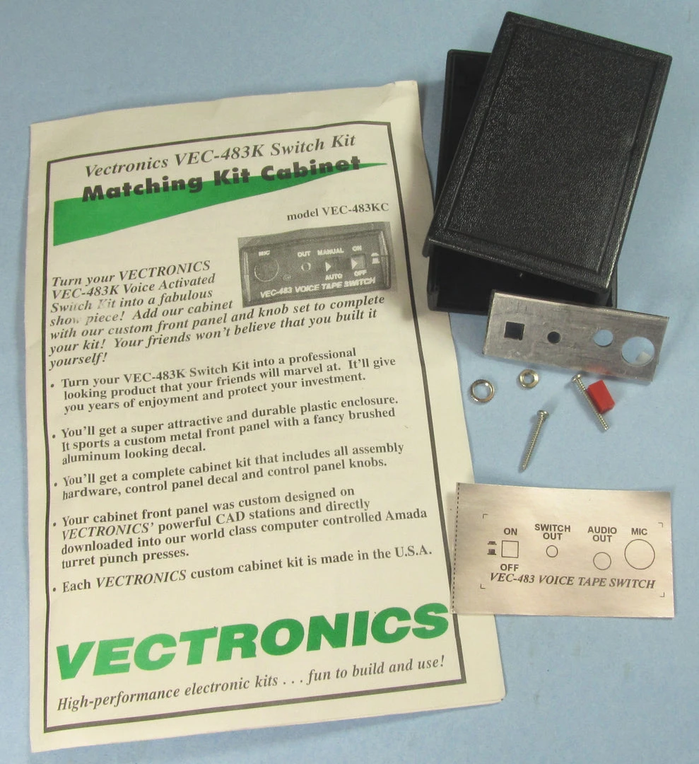 Custom cabinet for Voice Activated Tape Recorder Switch Kit. Includes durable plastic custom cabinet, control panel knobs, all assembly hardware and front panel brushed aluminum looking decal.