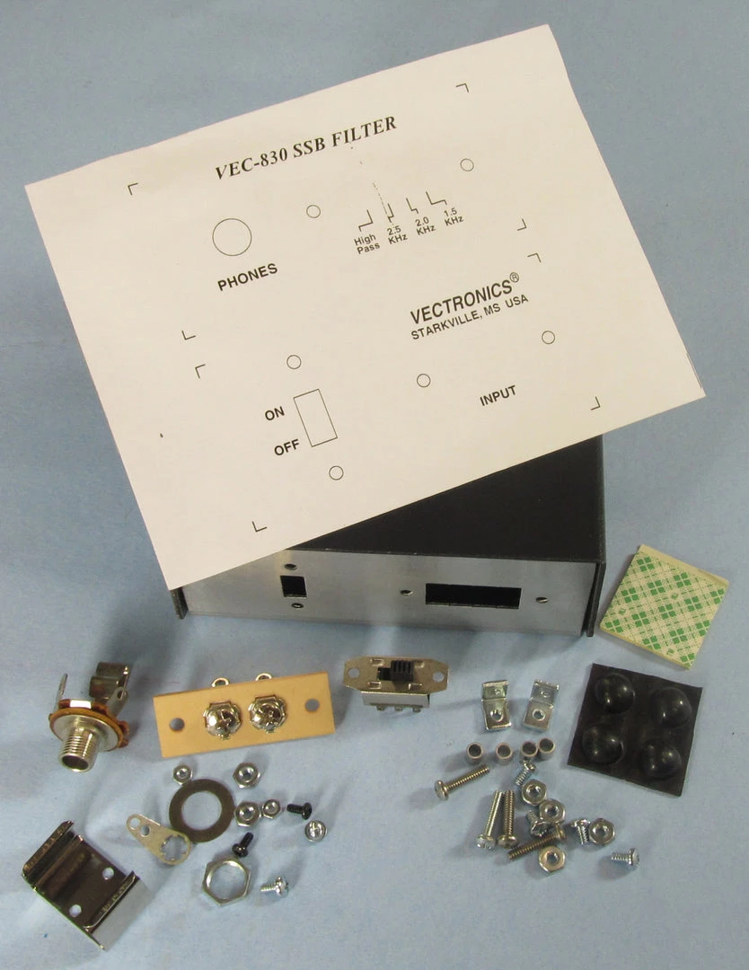All metal cabinet for the super SSB audio filter kit VEC-830K. Comes complete with knobs, hardware and rubber feet. Has brushed aluminum looking front panel decal.